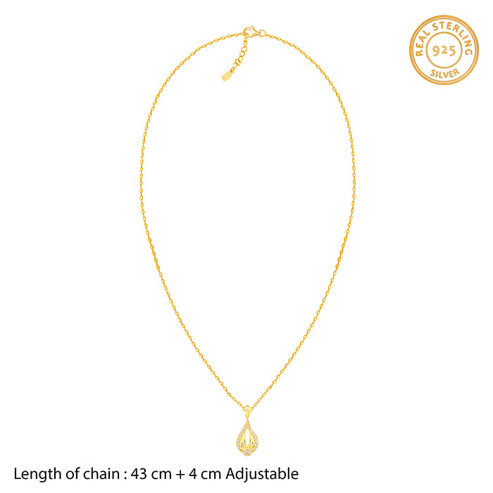 This golden pendant features a teardrop motif with line designs adorned with zircons.