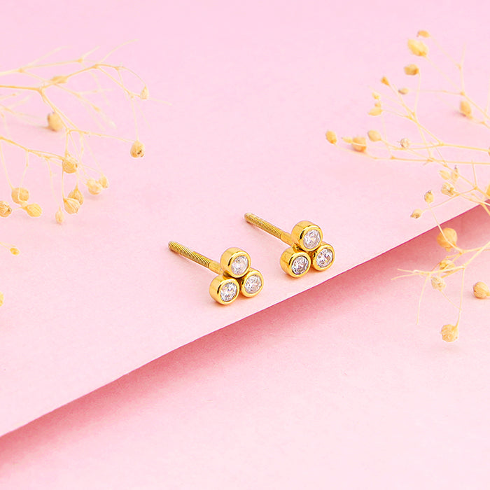 These golden earrings feature a singular zircon piece embedded in a triangular three-stoned design stands for a minimalistic elegant vibe.